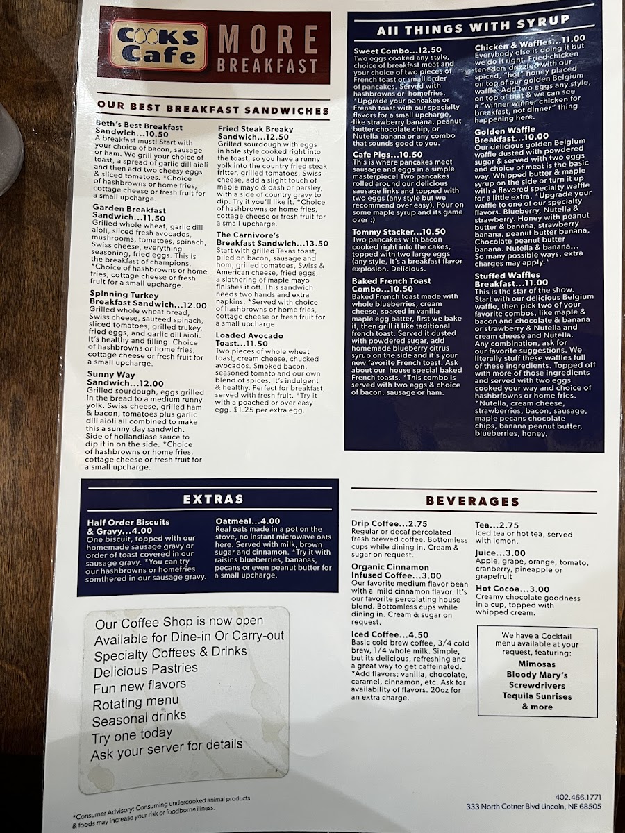 Welcome to Cooks Cafe, where comfort meets flavor at 333 N Cotner Blvd, Lincoln, NE! This cozy spot specializes in hearty breakfasts that define the morning experience.